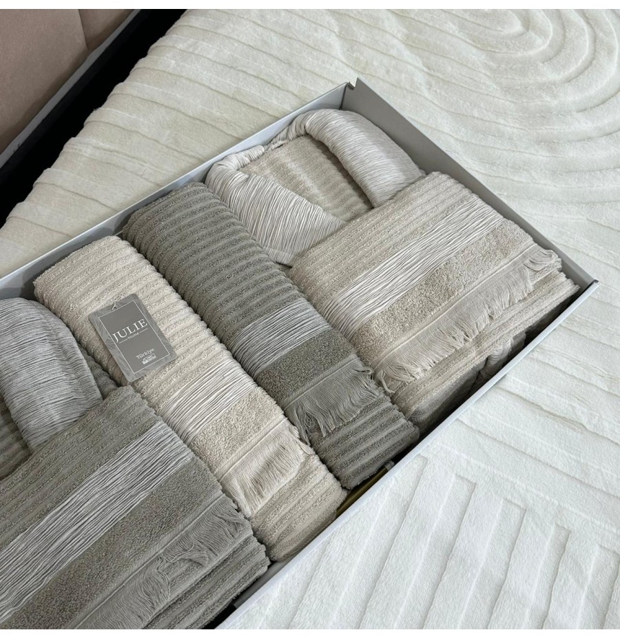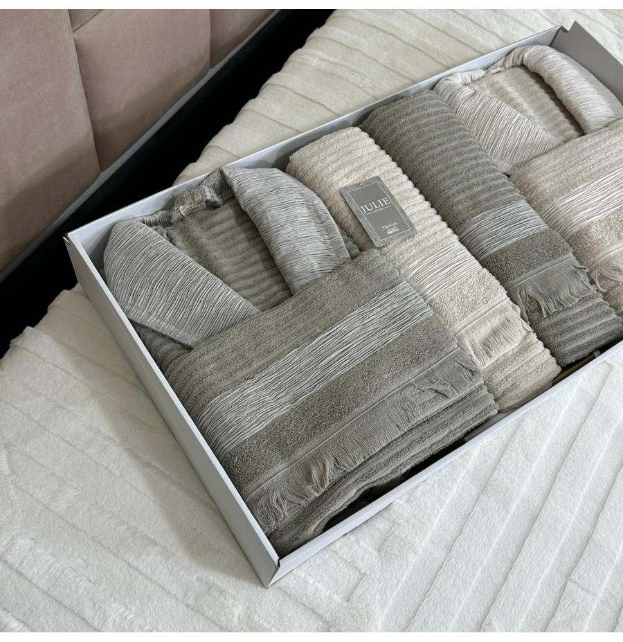 Un coffret raffiné pour couples, parfait en cadeau ! Contient 2 peignoirs de taille standard convenable pour les tailles (tailles M , L , XL), 2 draps de bain (150x100 cm) et 2 serviettes (90x50 cm) en coton épais, doux et ultra-absorbant. Élégance et bien-être garantis !