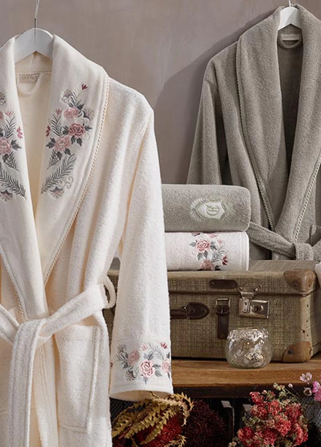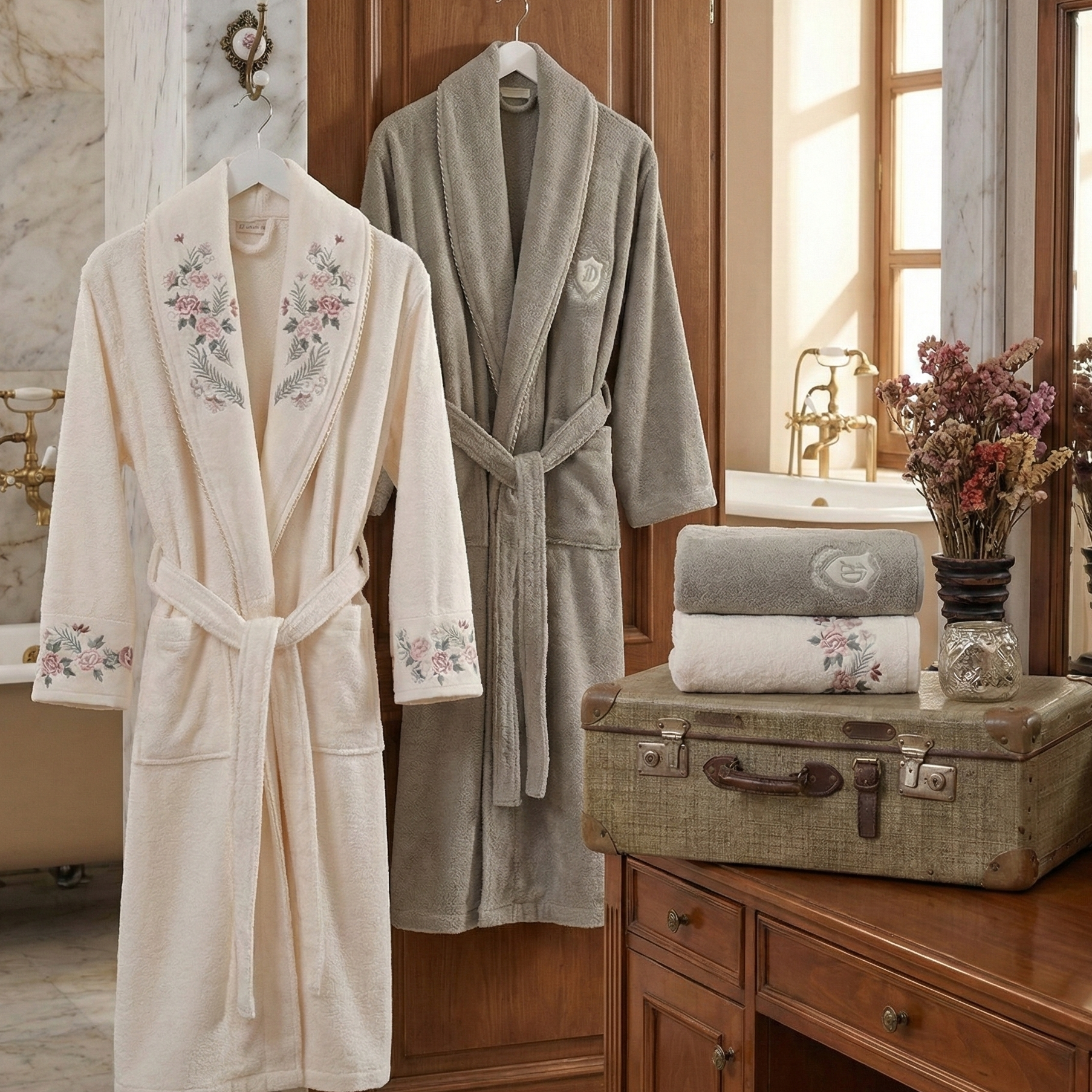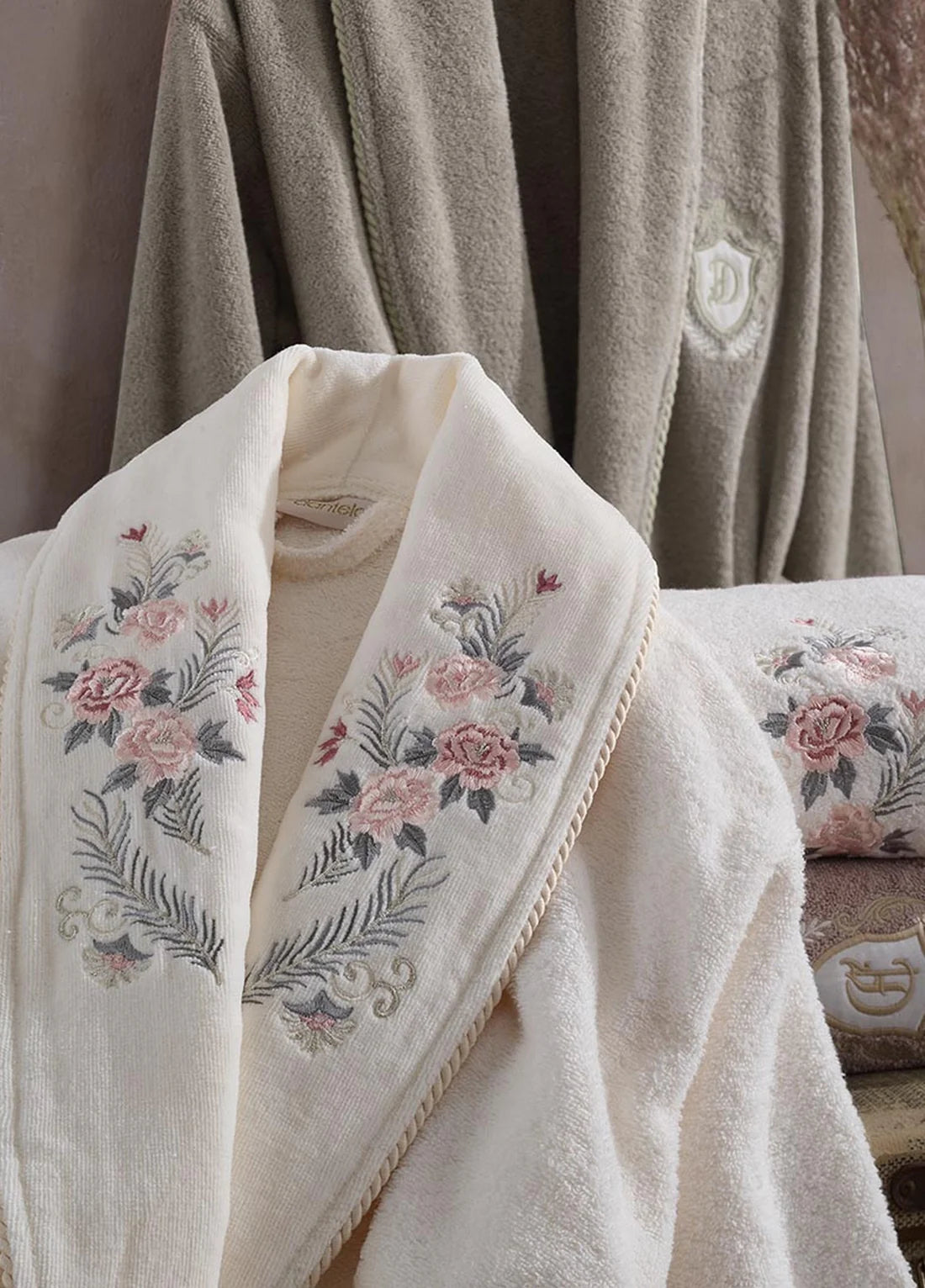 - Découvrez l'élégance ultime avec l'Ensemble Magnifique de Peignoirs Janset, comprenant 6 pièces fabriquées en coton turc de la plus haute qualité, offrant une sensation plus douce que le coton ordinaire. Les peignoirs pour femmes, ainsi que les serviettes de bain et de mains, sont ornés de délicates broderies dorées. Cet ensemble premium peut redéfinir entièrement votre salle de bains.